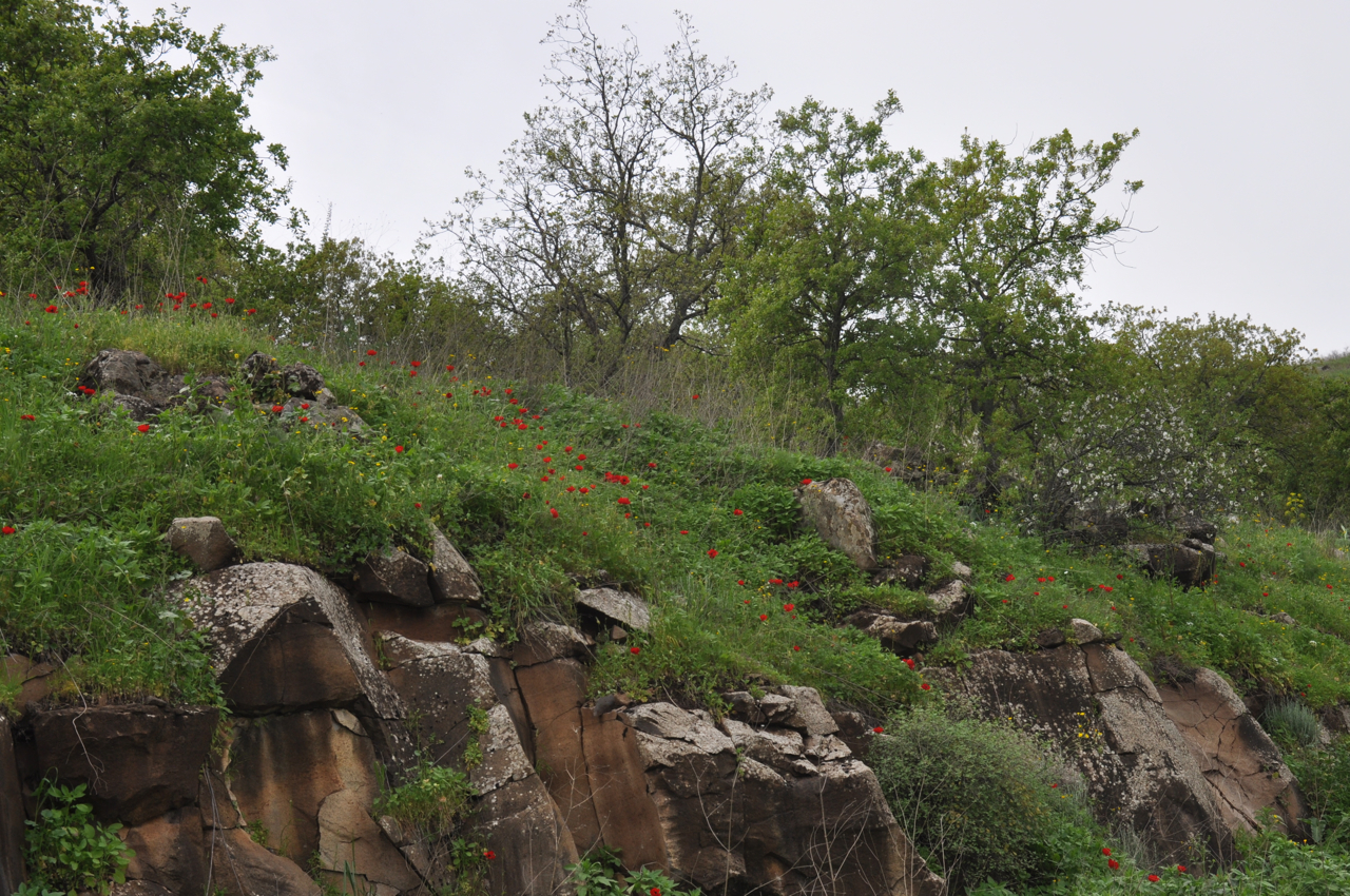 On a tour of the Golan last week we saw red anemones growing on the hill as we walked down into the wadi to Breikhat Meshushim (Hexagonal Pool).