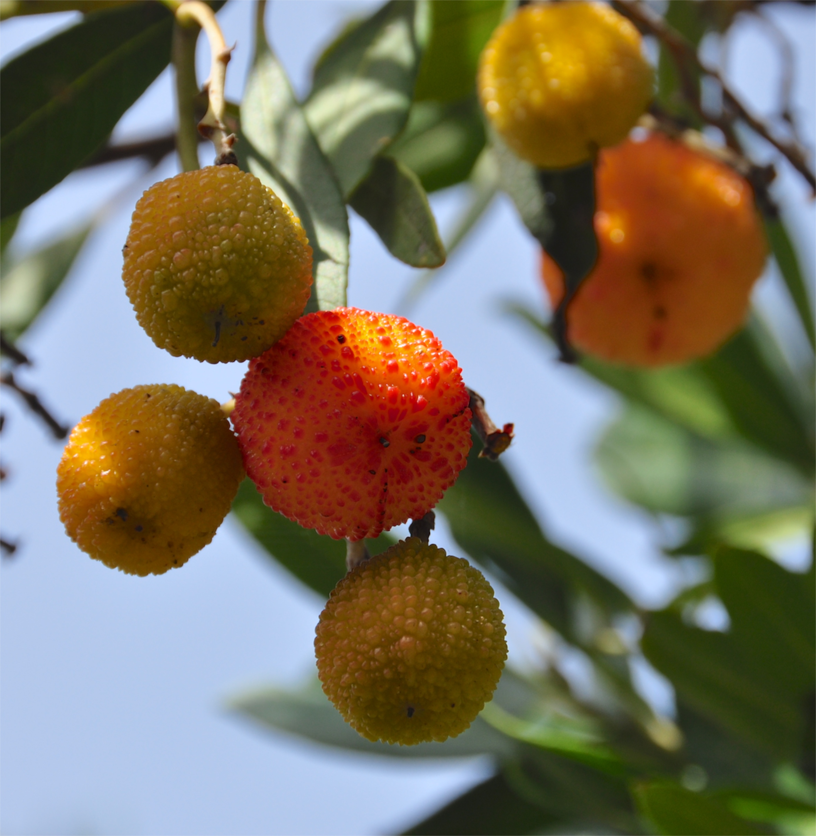 There is another related tree, Arbutus unedo, that also grows in this region. The leaves have a saw-tooth edge and the fruit is bumply, orange-red when ripe. The name ‘unedo’ is explained by the Roman historian, Pliny the Elder, as being derived from unum edo “I eat one”, which seems appropriate as most people find the fruit bland and mealy.