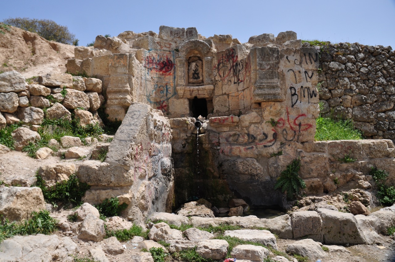 The spring is typical of those found in the Jerusalem area, consisting of a dugout chamber where the water flows from the contact between the water porous limestone and a layer of marl which as it contains clay is more impervious to water. A 39 meter underground tunnel channels the water to the ruins of a building, the apse of a 6th C Byzantine church, where it cascades down into a small pool in front of the apse framed by two pilasters. The apse gave the spring its Arabic name because henya is a round niche carved out of stone. From there it follows a channel to fill a large (11 x 7 meter, 2 meters deep) rectangular pool (though I noticed that now the pool is almost empty).