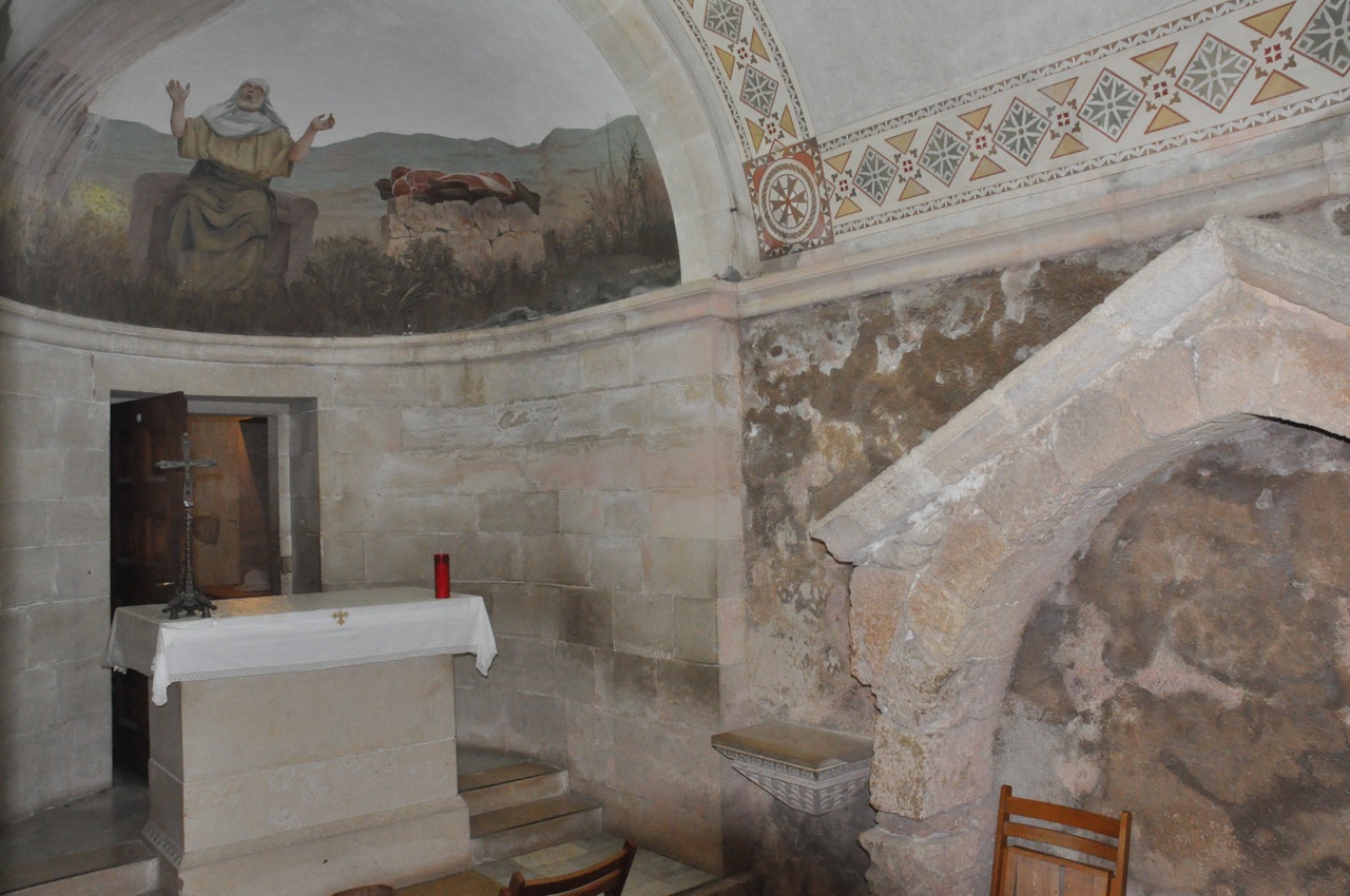 The tower chapels have eastern apses and therefore are entered through doors in their apses. In the southern chapel the apse is decorated with a painting of the prophet Elijah in his confrontaition with the false prophets of Ba’al on the Carmel. On the floor is the original Byzantine mosaic floor with white, black and red tesserae, which was restored once in the Crusader period and which has been taken up and recomposed partially in a new location. The crosses portrayed in the mosaic floor indicate that it must have been laid before 422, when the Emperor Theodosius II prohibited the use of crosses in pavement mosaics out of respect.