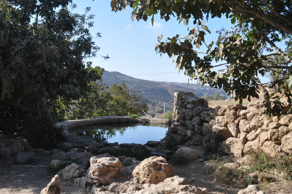 A hike to a maayan, a natural spring where water finds its way out of the limestone hillside, is a great outing for the whole family. At some point someone cut into the bedrock to make a pool, perfect for a dip on a hot summer day. There is even a trail, Shvil HaMayaanot, from just before Even Sapir that goes by a number of springs and pools. Drive out to the Jerusalem Biblical Zoo near Malcha (itself a fun destination for the whole family) and park the car at the farthest parking lot, a road with a blue trail marker continues west to 2 springs (it’s also possible to drive it but then it won’t be a hike). To your right the hill above the trail is called Rekhes Lavan (White Ridge) because of the kirton (chalk, a soft kind of limestone) and the valley below to the left with the train tracks is Nahal Refaim (Valley of Ghosts). After following the winding road you will come to a small parking area, a green Parks sign and steps on your right.