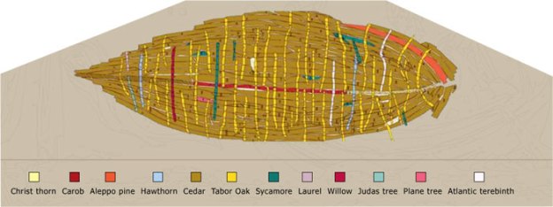 The ship’s deep, round stern and bow are of fine design, and the planks were affixed to the shell with mortise and tenon joints, locked into place with tapered hardwood pegs. The superior quality of the construction shows that the boat builder was an excellent craftsmen. The boat was constructed of Lebanon cedar with Tabor oak used for the framing. The evidence of repeated repairs shows the boat was used for several decades, perhaps nearly a century. Numerous types of wood were used, a profusion of native trees – Christ Thorn, Carob, Aleppo pine, Hawthorn, Sycamore, Laurel, Willow, Judas tree, Plane tree and Atlantic Terebinth.