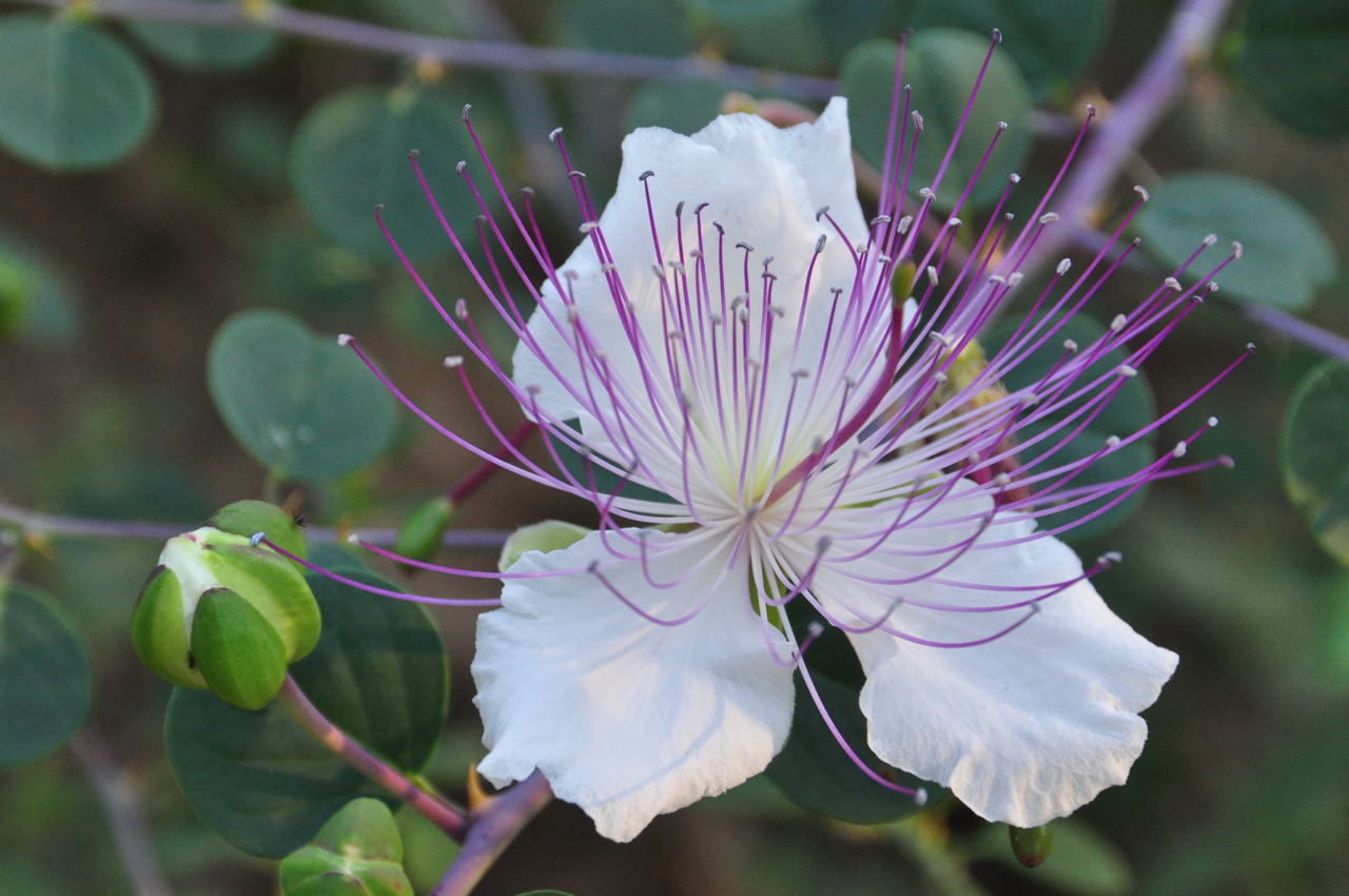 The flowers are complete, sweetly fragrant, showy, with four sepals, and four white to pinkish-white petals, many long violet-colored stamens, and a single stigma usually rising well above the stamens. The caper flower is the emblem of Neot Kedumim, the Biblical Landscape Reserve. The caper plant is a citizen of the world, native to the Mediterranean, East Africa, Madagascar, south-western and Central Asia, Himalayas, the Pacific Islands, Indomalaya and Australia.