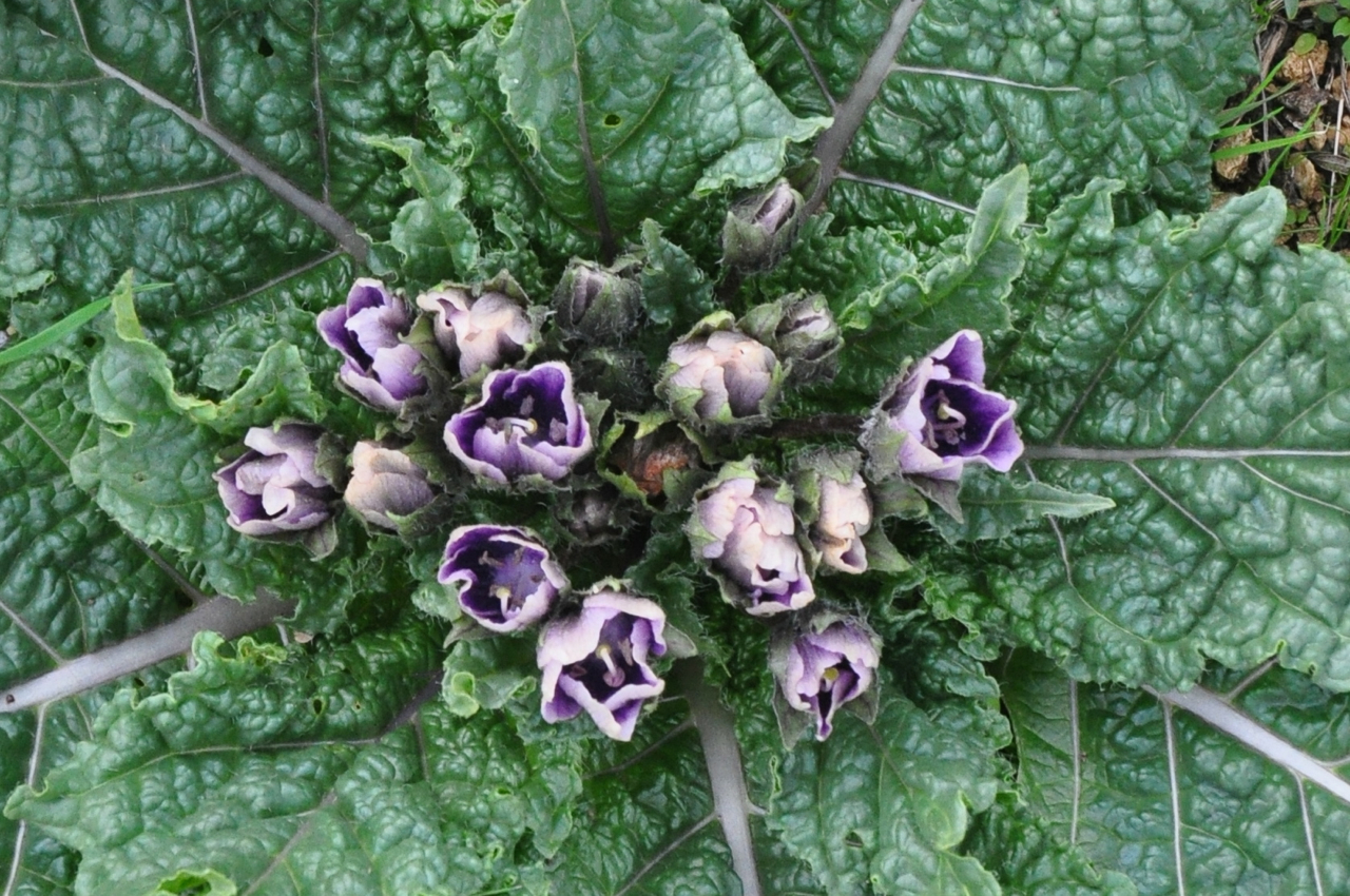 This perennial has a clump of dark green leaves, resembling somewhat the leaves of chard; in the center appear purple flowers. The fruit, orange to red berries, resembling cherry tomatoes, ripen by late summer, at the time of the wheat harvest. The plant has a tap-root (splits into two sometimes) that has a peculiar shape resembling a miniature person. All parts of the mandrake plant are poisonous; it acts as a parasympathetic depressant, hallucinogen, and hypnotic.