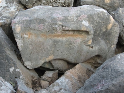 32.498508°N 35.501446°E] on the western part of an existing hippodrome of which very little is known. The structure was an oval, 102 x 67 meters, of limestone blocks on a foundation of basalt. There were 10-12 rows of seats that would have held 5000-7000 spectators. Below is a panorama of the amphitheater at Beit Shean. I took 3 photos standing inside the amphitheater and 3 outside on the edge and stitched them together using Photoshop. Click on the images for a larger view.