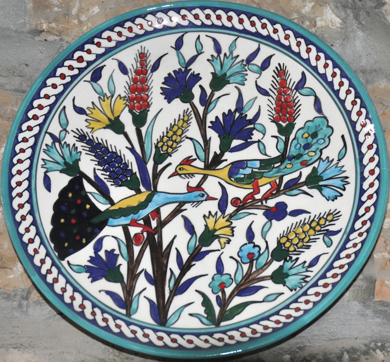 In 1965 the Karakashian family moved to live and work in the Old City, where they created a studio, “Jerusalem Old City” on the Via Dolorosa between El Wad and Khan El Zeit (recently they moved to 3 Greek Orthodox Patriarchate Street in the Christian quarter). The main designs are those of arabesques, various bird designs, flowers, grapevines, a fawn, fish and biblical scenes on ceramic vessels and tiles.
