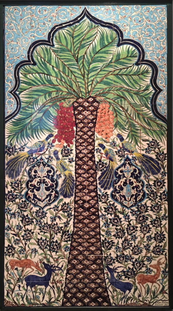 The creative force behind the Balian workshop was Marie Balian, who had studied painting in Lyon, France. One outstanding example is her dialogue with the images of the tree, gazelles and lion from the Hisham Palace painted in various combinations. By the early 1980s Marie Balian was working on larger compositions of many tiles, as if they were monumental canvases.