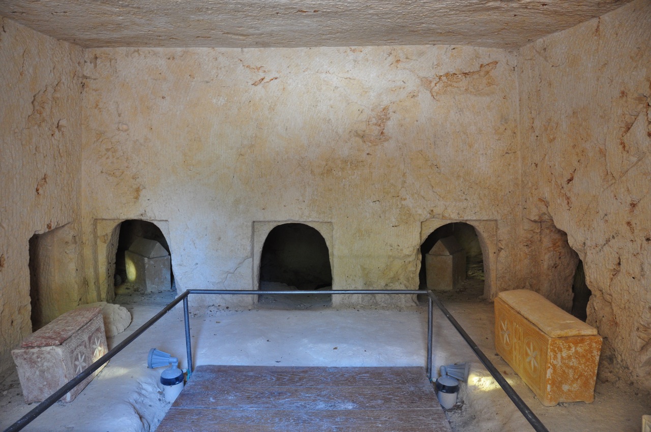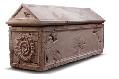 Made of reddish limestone, mizzi ahmar, from the Arabic, this is very hard stone and would have been difficult to carve – perhaps that made it all the more appealing. Originally, Netzer suggested that the side panels of the sarcophagus were decorated with five flower medallions. There are sarcophagi like that, one in the Louvre taken from the Tomb of the Kings, one outside the Islamic museum on the Haram el-Sharif. Based on the museum reconstruction, it seems that these panels are plain.