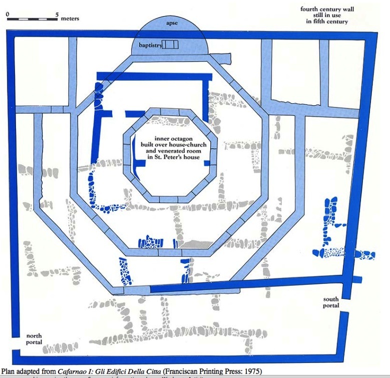 There are ruins of another octagonally shaped church at Capernaum. The remains of a 5thC church were uncovered that consist of a central octagon with eight pillars, an exterior octagon with thresholds still in situ, and a portico. Later an apse with a pool for baptism was constructed in the middle of the east wall. The central octagon was placed directly on top of the walls of Simon Peter’s house with the aim of preserving its exact location.