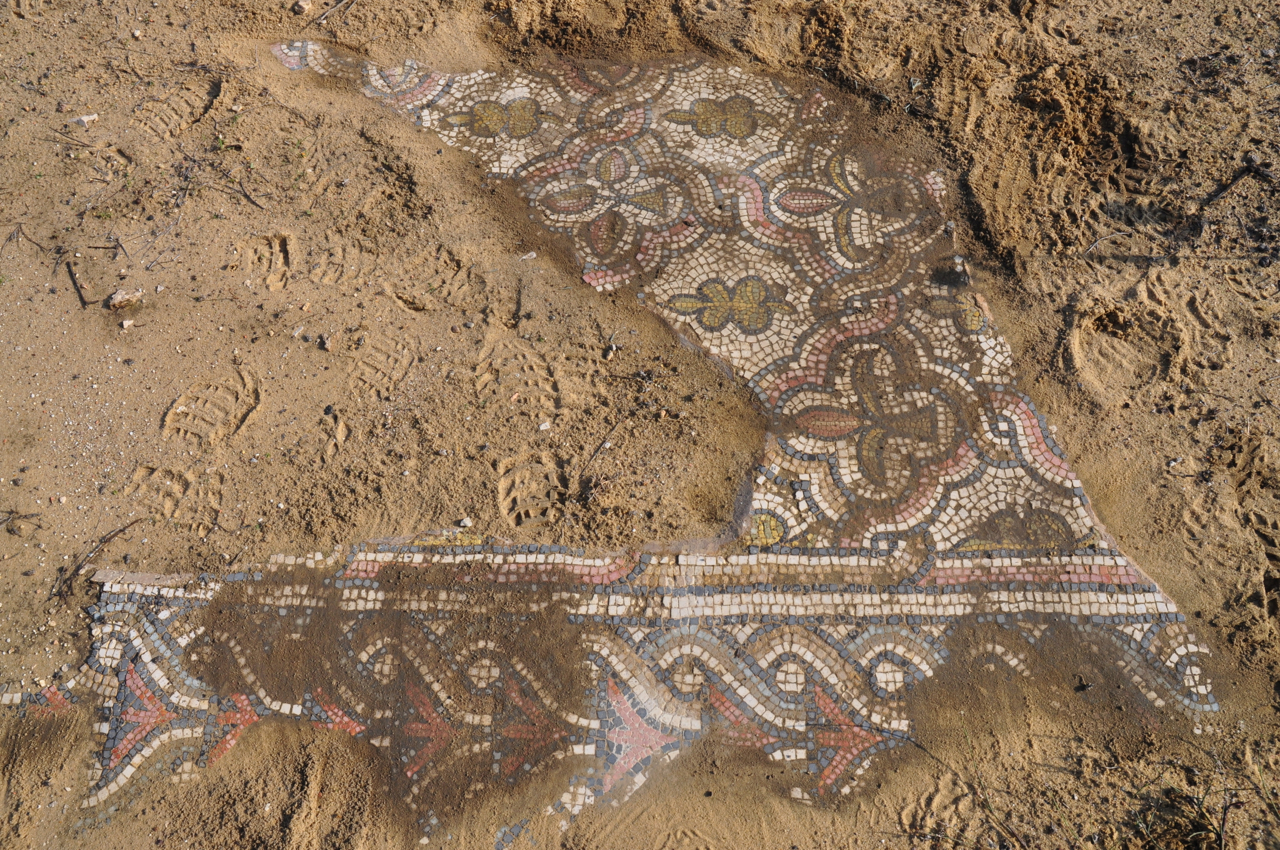 The floors are covered in mosaics in geometric and floral designs in white, black, yellow, green and red stone tesserae. The mosaics have been mostly covered with felt mats and sand to protect them.