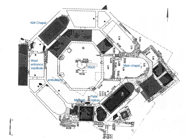 According to our understanding the Kathisma church was renovated in the 6thC and used as a mosque in the 8thC after which it was destroyed. A mihrab, or prayer niche facing Mecca was built into the southern wall of the outermost octagon. This means that the church was not destroyed during the Persian conquest and existed at the time of Abd el-Malik who commissioned the building of the Dome of the Rock, a martyrium in octagon shape over a rock – it may have been the inspiration for what has been called the earliest example of Islamic architecture.