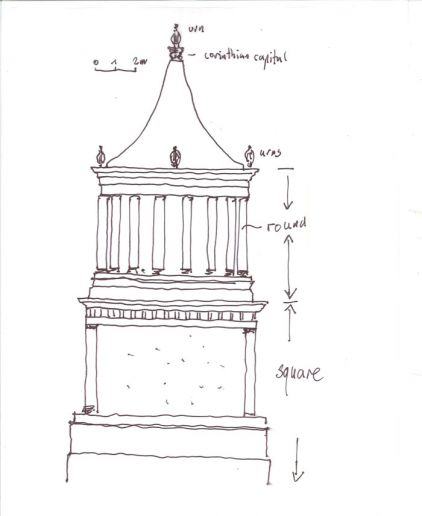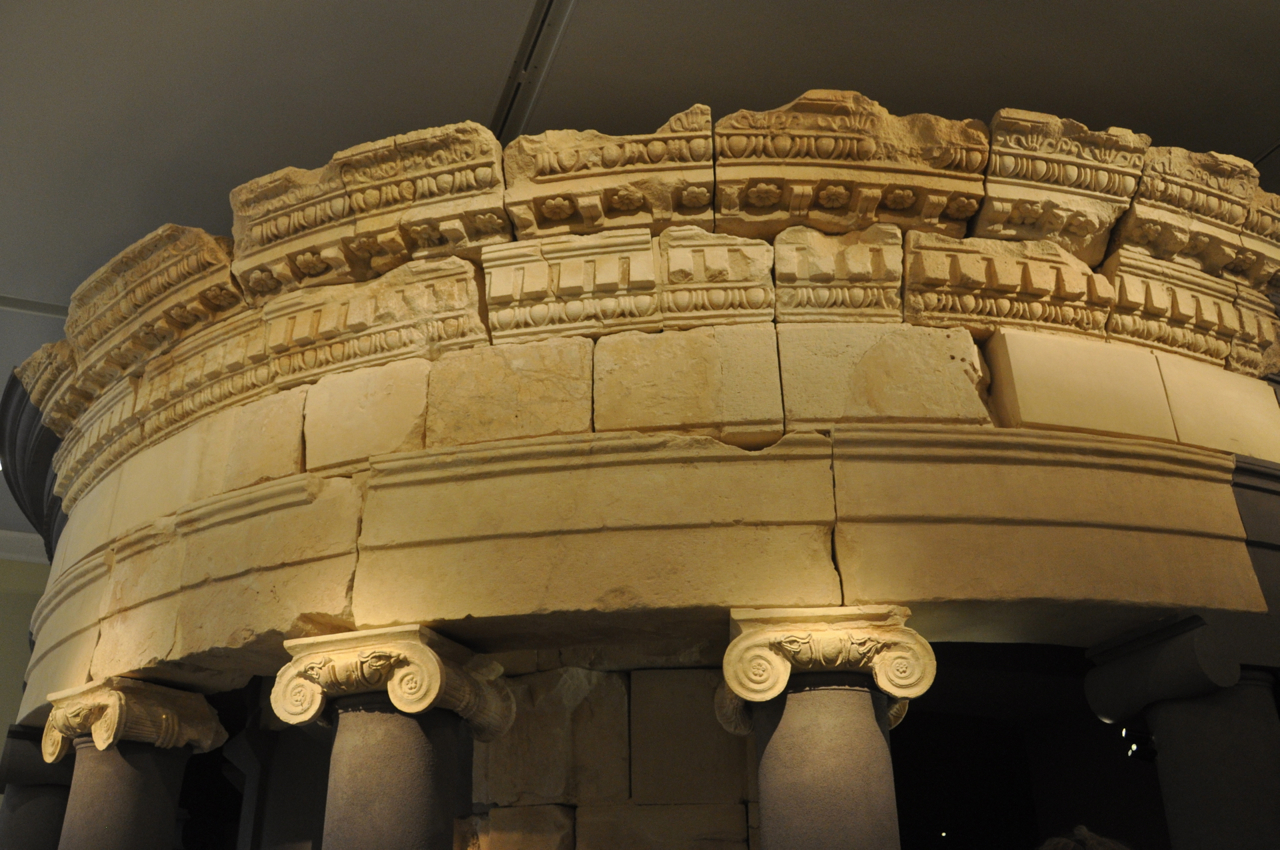 Netzer drew on his familiarity with Herod’s oeuvre and his expertise as an architect and archaeologist to imagine the mausoleum. Netzer conceives a colossal three-story monument – 25 meters high. The first level is cube-shaped – only the base exists and can be viewed at Herodium halfway up the mountain on the north side. The second level is a tholos, a cylindrical structure with Ionic columns and crowned with a conical roof. In addition to the Roman style, there are Nabatean elements to memorialize Herod’s Nabatean mother Cypros – two stone replicas of Nabatean funerary urns are on display out of five that adorned the roof.Nabatean Funerary urn