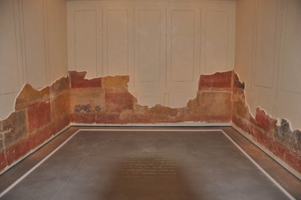 Throne Room, JerichoFollowing Herod the Builder, museum staff re-constructed three rooms from Herod’s palaces at the museum. The first room you enter is a replica of the throne room from Herod’s third palace at Jericho, excavated by Netzer for his doctorate. The original frescoes with their intense natural colors were removed from the palace and moved to the museum. So fond of Herod, Augustus had permitted him to mine cinnabar, a red mineral pigment, from his private property in Almadén, Spain.