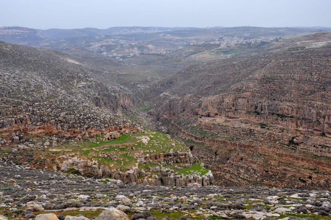 Open a TaNaKh and read 1 Samuel, chapters 13 and 14 for the account of the battle between King Saul and his son Jonathan against the Philistines. The Israelite forces are camped at Geva and the Philistines are on Mikhmas with the wadi separating them. Jonathan sneaks out of the camp at night and hidden by the deep walls of the canyon makes his way to the Philistine garrison… We were standing on the ridge reading the account of the battle, overlooking the area where it took place.