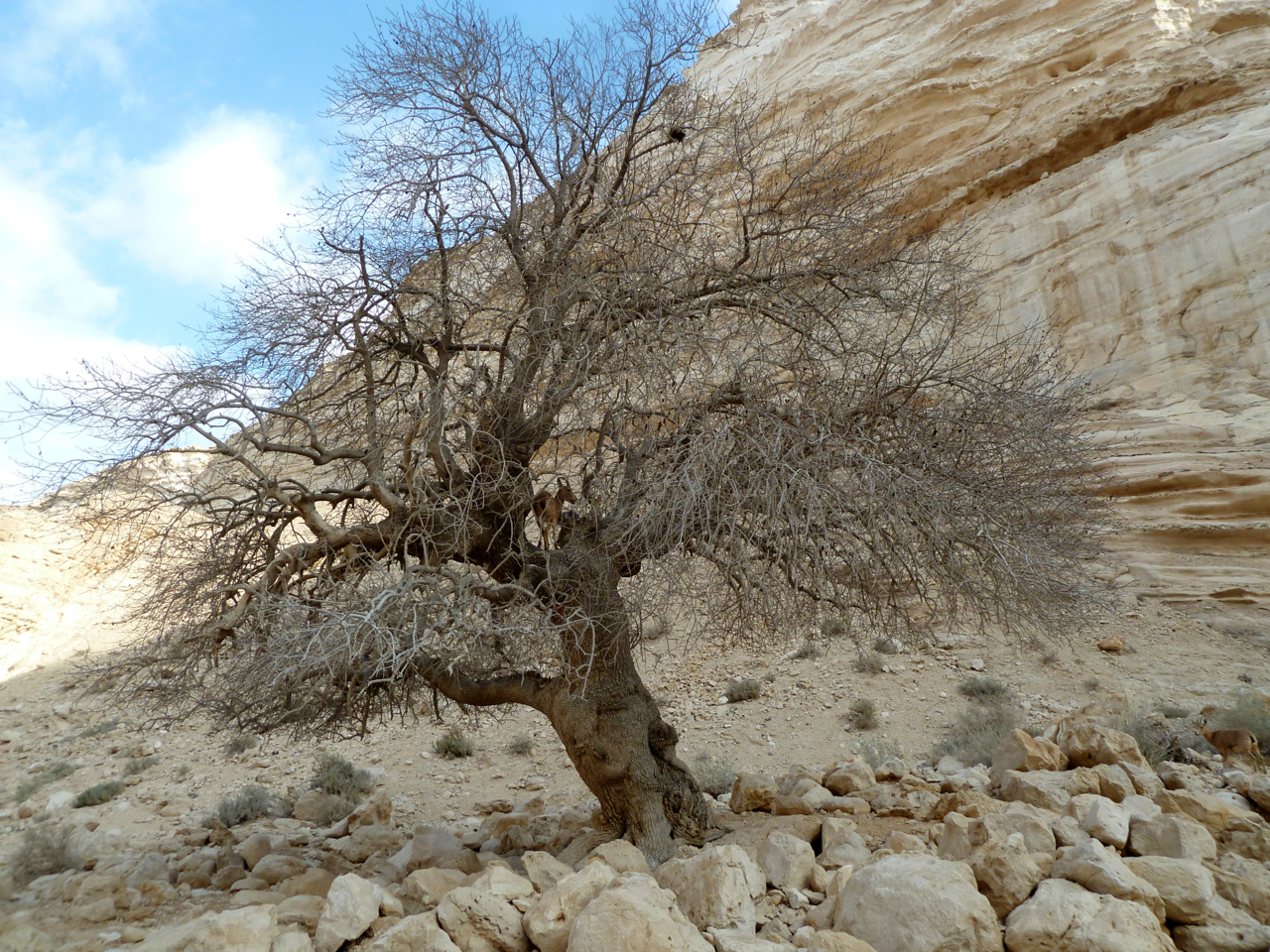 As you enter the reserve you will notice an old (250-year-old), solitary terebinth, a Pistachia Atlantic, אלה in Hebrew, rooted in the rocky soil. This tree normally grows in colder, semi-arid zones with annual rainfall of over 300 mm – this tree is a reminder of a forest that flourished here when the climate was colder and rainier. Looking up you may see Griffon vultures that nest on the cliffs soar overhead. There are also quite a few ibex that are attracted by the water. Ibex, a kind of mountain goat, are very good climbers on the steep rocky slopes and even up in a Pistachio tree.