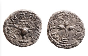 Coin issued by Jewish rebels in 135CE Obverse: Star above facade of Temple showing Ark of Covenant “Shimon”. Reverse: Lulav/palm branch & etrog “For freedom of Jerusalem”